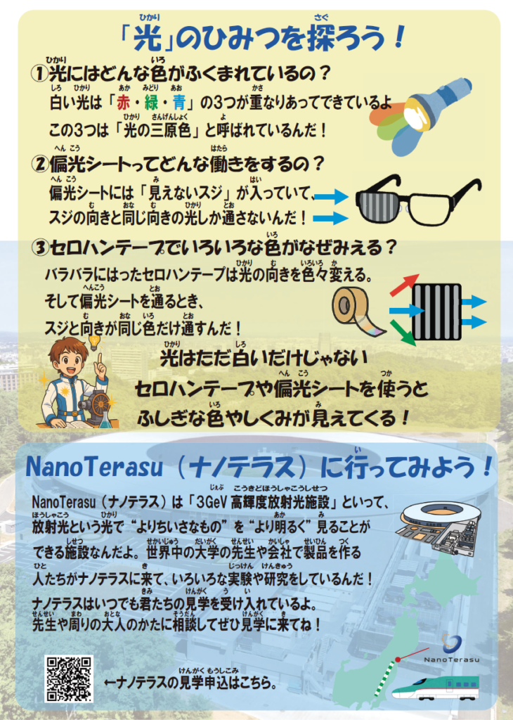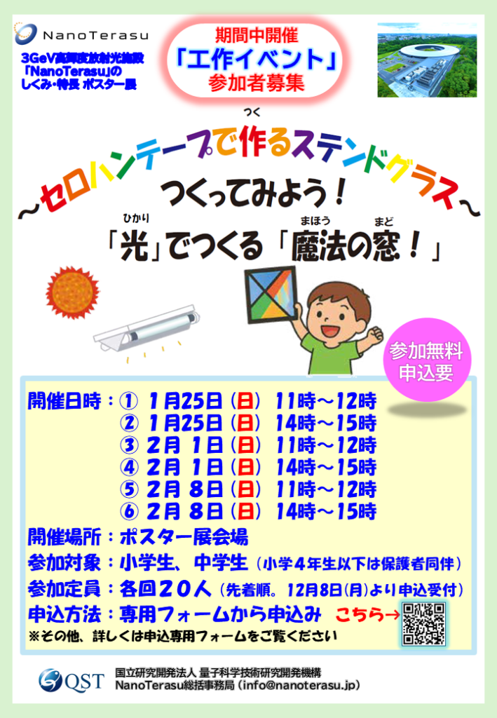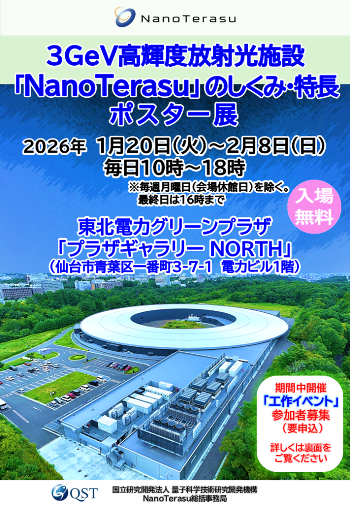 2026年1月20日(火)から2月8日(日)まで、仙台市の東北電力グリーンプラザにおいて、「NanoTerasu」のしくみ・特長 ポスター展を開催しました。また、期間中の日曜日には、小中学生の皆さまを対象とした工作イベントも開催しました。開催期間中、たいへん多くの皆さまにご来場・ご参加いただき、ありがとうございました。