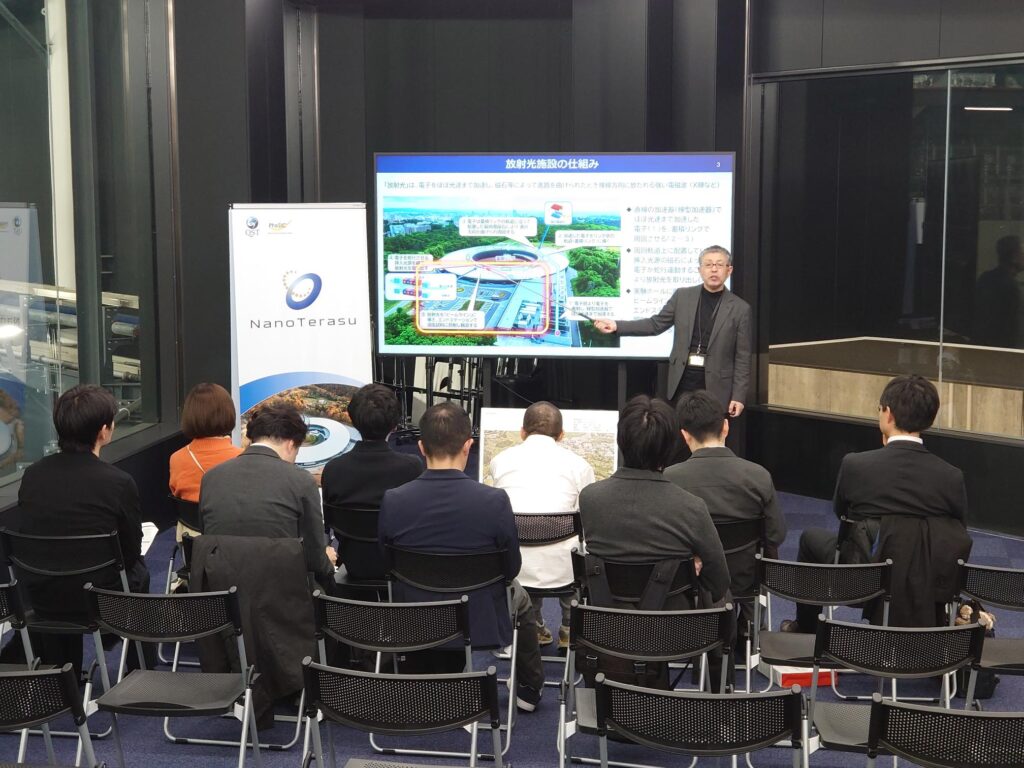 2025-12-16 CATEGORY: PickUp 視察・見学12月16日、NanoTerasu総括事務局広報グループ髙橋参事がご案内し、トータルメディア開発研究所とリバネスの皆様にNanoTerasuをご視察いただきました。