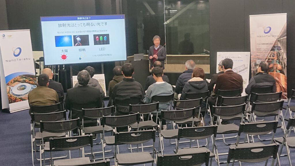 2025-12-12 CATEGORY: PickUp 視察・見学12月12日、シルバーセミナーせんぽ会の皆さんがNanoTerasuを訪問され、NanoTerasu総括事務局広報グループの高野と阿部から楽しくわかりやすいNanoTerasuの説明を受けた後、加道広報グループリーダーの案内で実験ホールを見学しました。