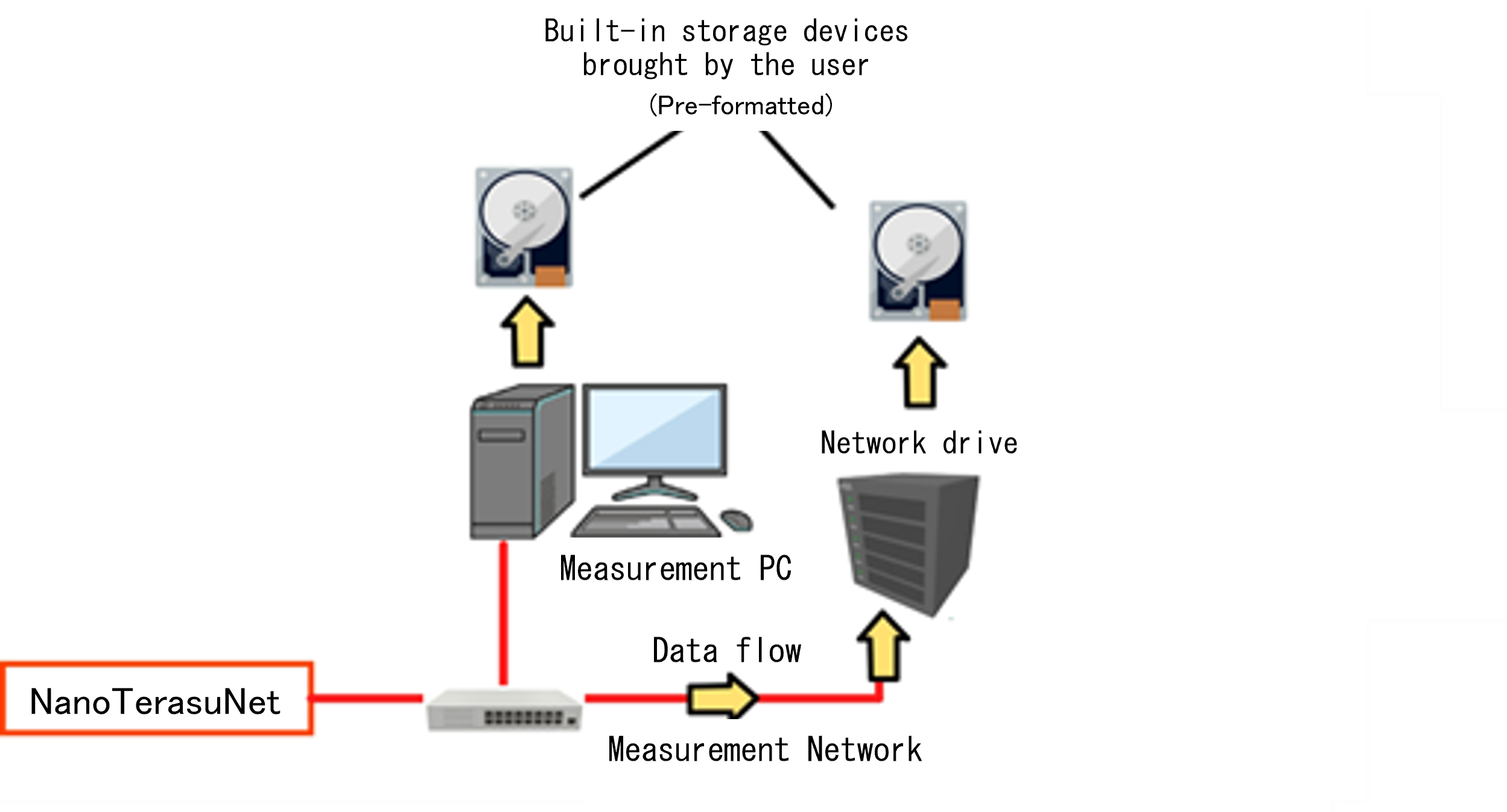 - To obtain measurement data files, first copy them from the measurement PC to a storage device on the dedicated network drive, then either connect your brought-in PC to the Download-Only User Network, or use a security-verified external storage device such as a USB memory stick with the data-copy-dedicated PC installed at the beamline.